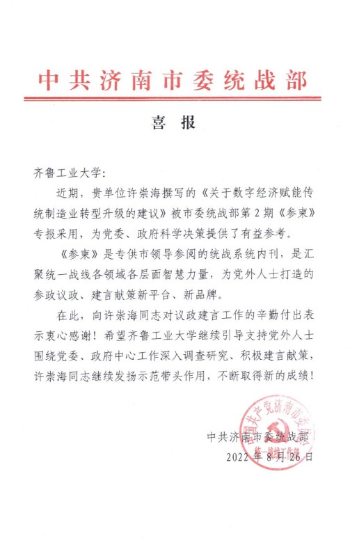 近日,中共济南市委统战部专门向齐鲁工业大学(山东省科学院)发来喜报,表扬学部主任许崇海撰写的《关于数字经济赋能传统制造业转型升级的建议》被济南市委统战部第2期《参柬》专报采用,为济南市委、市政府科学决策提供了有益参考。