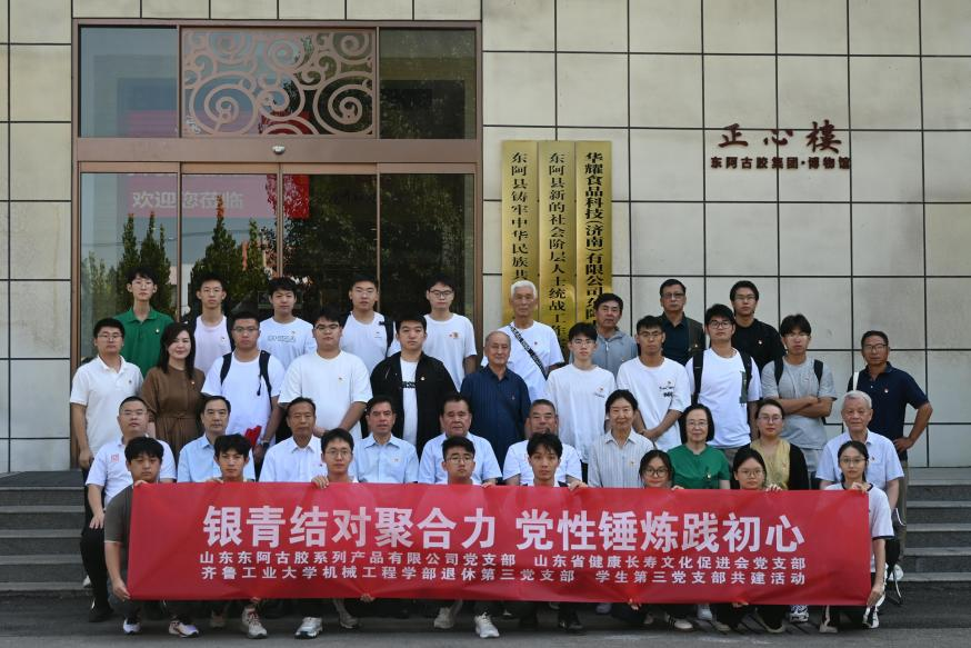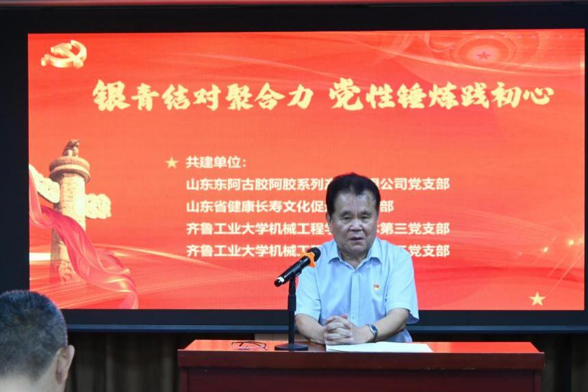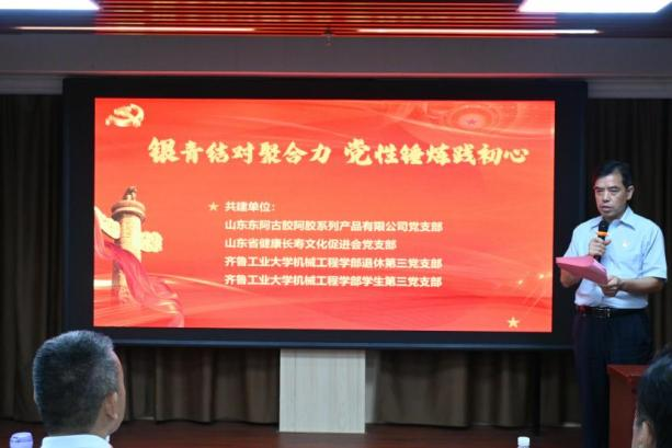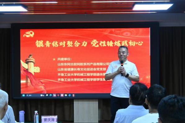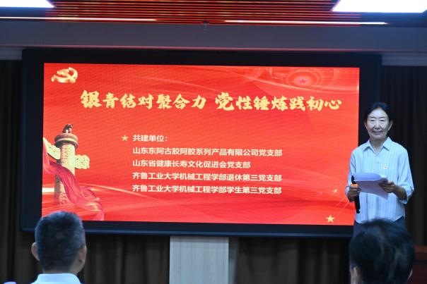 9月9日,齐鲁工业大学机械工程学部退休第三党支部、学生第三党支部,携手山东东阿古胶系列产品有限公司党支部及山东省健康长寿文化促进会党支部,于山东东阿古胶系列产品有限公司共同开展了“银青结对聚合力,党性锤炼践初心”主题支部共建活动。山东东阿古胶系列产品有限公司雷庆涛董事长、原山东省政协毕泗生秘书长、山东省健康长寿文化促进会常务副会长钟爱平、齐鲁工业大学机械工程学部党委书记吴笑兵、学部退休第三党支部书记刘静萍出席活动,40余名师生党员参加此次活动?;疃裳谌持Р渴榧锹砭仓鞒?。